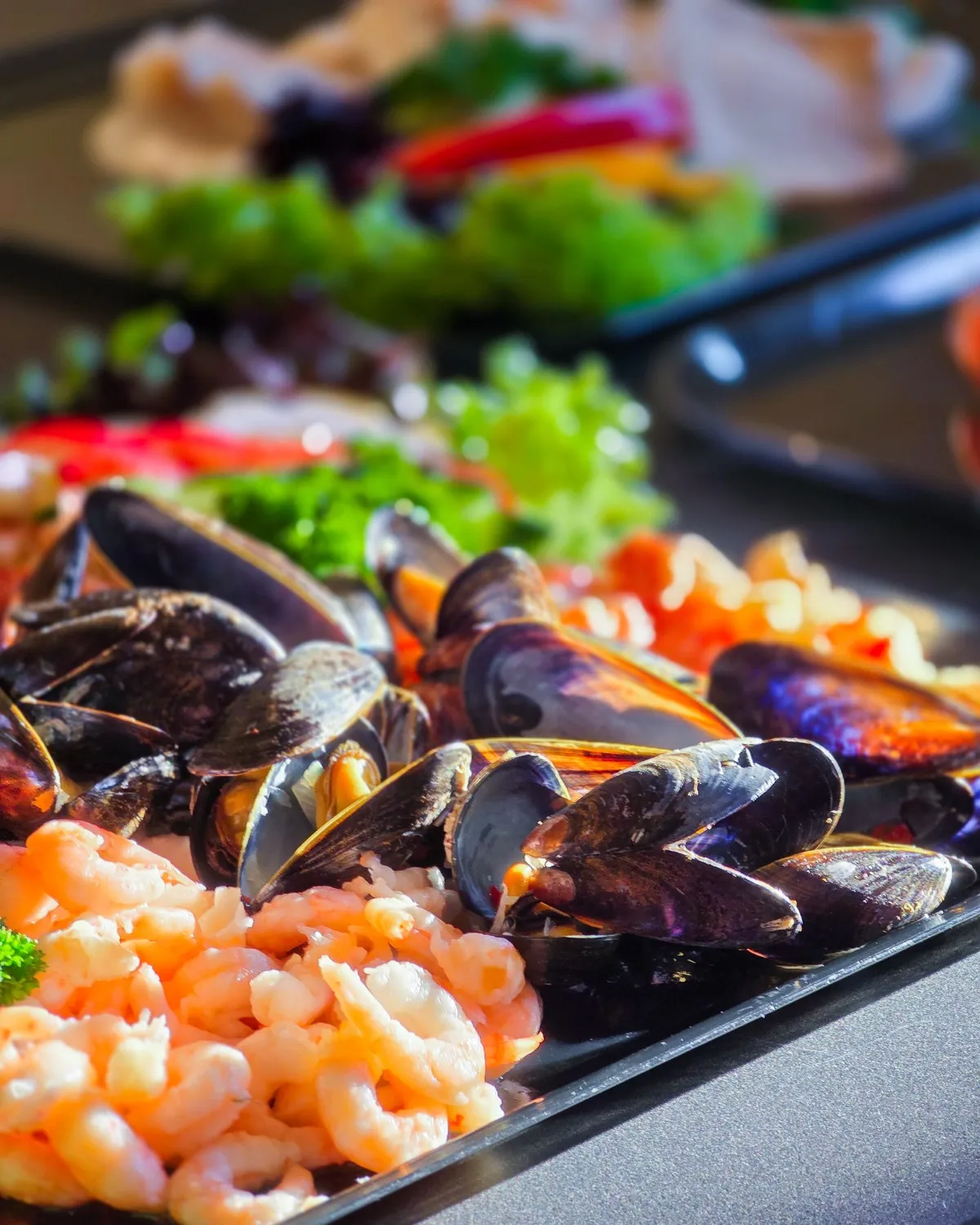 Hvetelefse med røkt ørret og kaviarkrem Spekeskinke og chorizopølse Chilimarinert scampi Marinerte oliven Hvitvinsdampede blåskjell Små spicy kjøttboller i hjemmelaget tomatsaus Marinert kylling Spicy krydderpølse Dadler med bacon Ovnsbakte gourmet poteter Sauser: Aioli, pesto, sweet chilisaus og urterømme, Focaccia