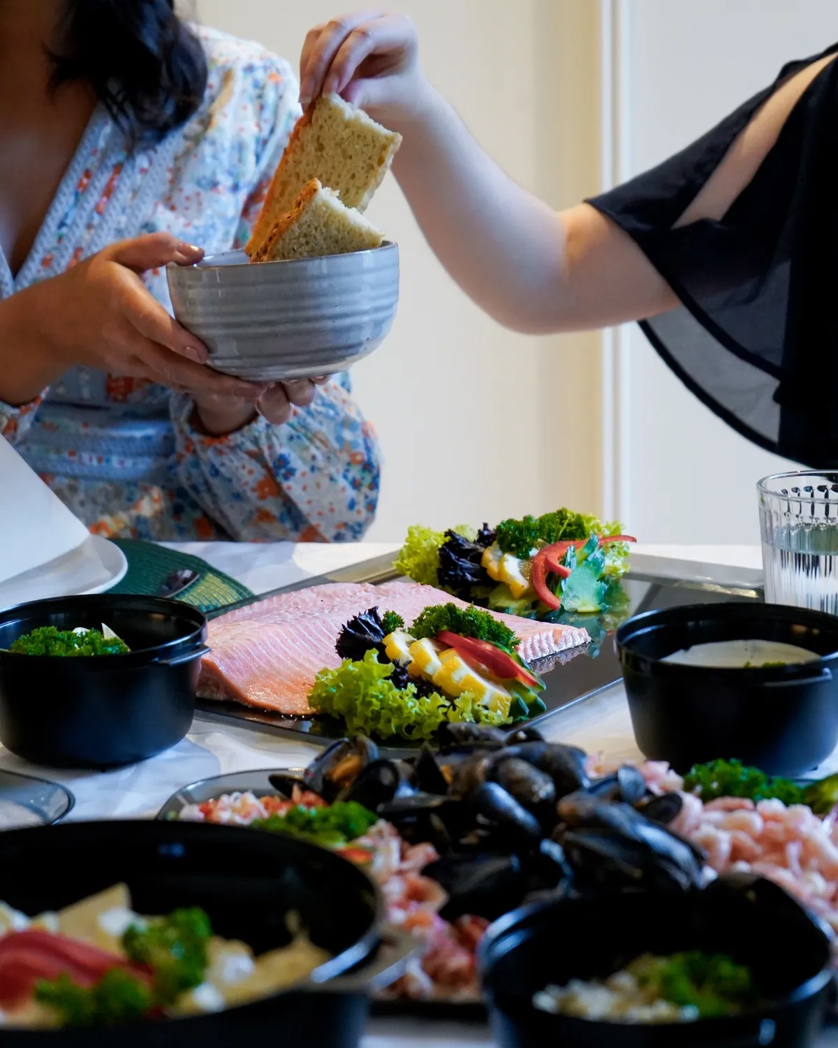 Hvetelefse med røkt ørret og kaviarkrem Spekeskinke og chorizopølse Chilimarinert scampi Marinerte oliven Hvitvinsdampede blåskjell Små spicy kjøttboller i hjemmelaget tomatsaus Marinert kylling Spicy krydderpølse Dadler med bacon Ovnsbakte gourmet poteter Sauser: Aioli, pesto, sweet chilisaus og urterømme, Focaccia